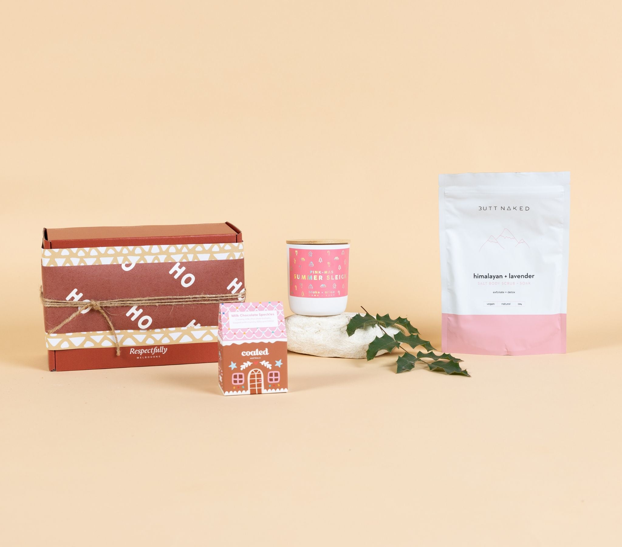 A sweet pink-themed gift that blends relaxation with a touch of festive indulgence. Featuring a soothing Himalayan and lavender bath soak to restore calm, a choice of Pink-mas Festive candle from Blake & Arloe with tropical notes of sunshine and cheer, and handcrafted milk chocolate speckles for a playful finish. Thoughtfully made in Victoria, this little gift of pink perfection brings serenity, warmth and joy to the season.