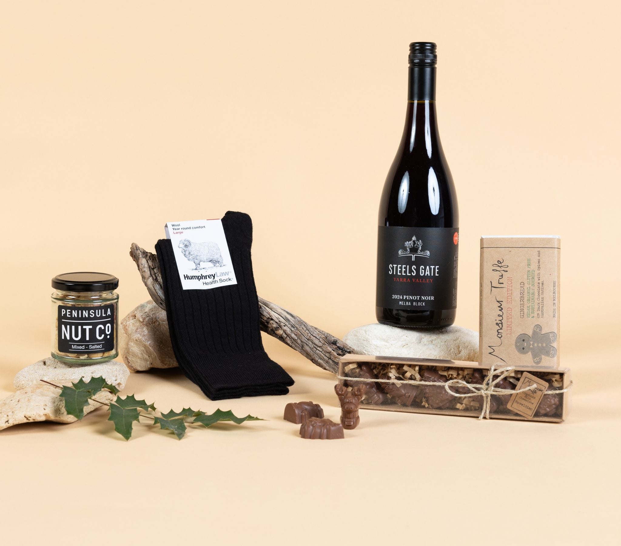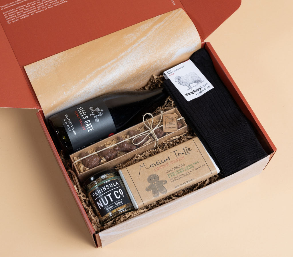 A timeless collection of classic gifts for him, red wine, socks and chocolate, reimagined for the festive season. Featuring a choice of minimal-intervention Victorian red wine, high-quality socks, and salted nuts, paired with handcrafted festive chocolates. Thoughtfully made in Victoria, this refined gift embodies warmth, celebration and Australian-made quality.