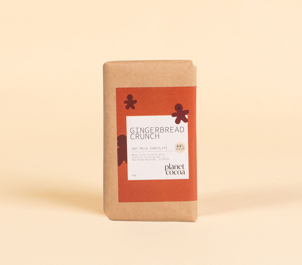 A festive favourite, this creamy spiced oat milk chocolate is filled with the most addictive, crunchy gingerbread biscuits. Crafted with traceable, ethical cocoa and thoughtfully sourced ingredients. Ingredients: Oat milk chocolate (cocoa nibs, cocoa butter, organic raw sugar, organic coconut milk powder, acacia gum, tapioca, organic oats), gingerbread (cocoa butter, organic panela, organic rice malt syrup, olive oil, cinnamon, ginger, wheat flour).
