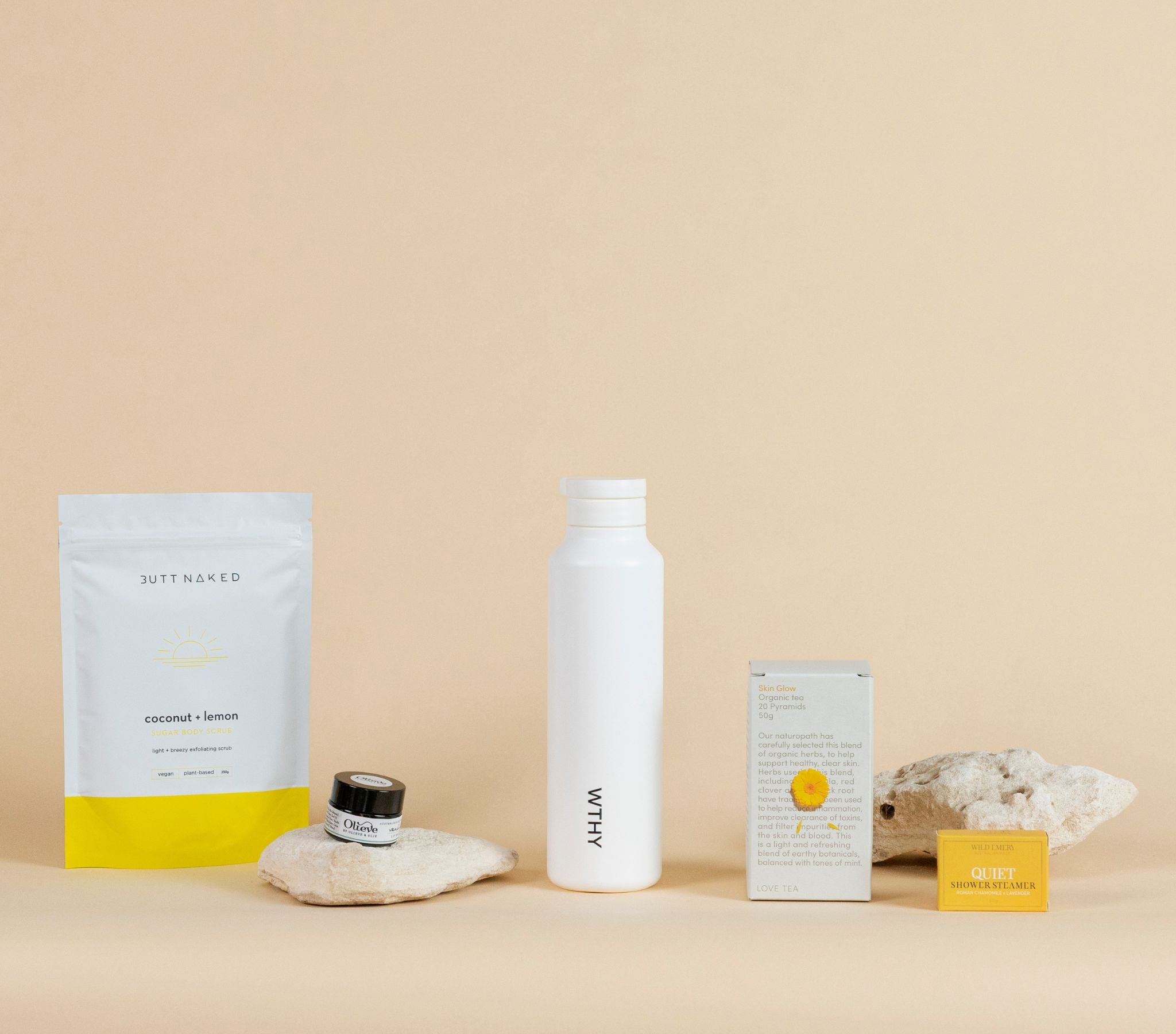 Designed to refresh and restore a natural glow, this gift brings together a collection of uplifting body care and wellness favourites, including a coconut and lemon sugar scrub, a glow shower steamer and a nourishing vanilla lip balm, paired with skin glow tea and a reusable sugarcane drink bottle to support hydration and everyday wellbeing.